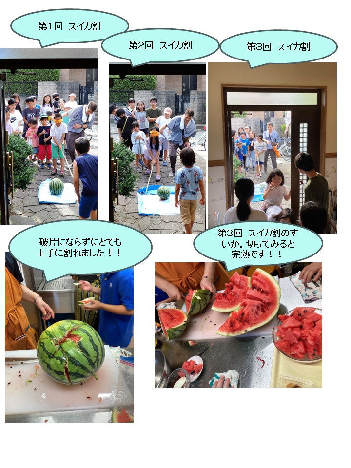 スイカ割。ちょうど熊本のスイカも終わり。できないかなとあきらめかけていたのですが、まだ手に入るよといってくださる方があり、立派な大玉スイカを4個手に入れることができました。