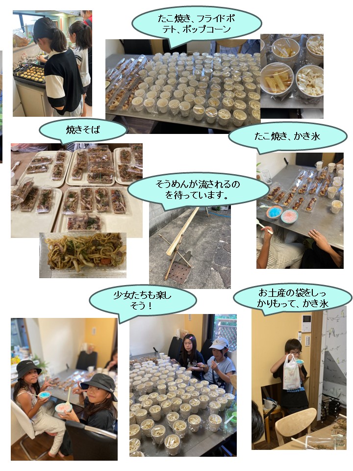 提供した食べ物は、焼きそば、たこ焼き、ポップコーン、フライドポテト、かき氷、そうめん。