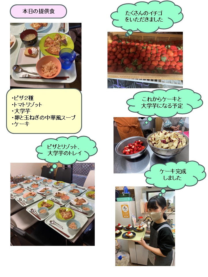 改めて本日の提供食は、ピザ2種、トマトリゾット、大学芋、卵と玉ねぎの中華風スープ、大きなイチゴの載ったパウンドケーキでした。