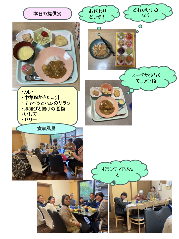 本日のメニューは、カレー、キャベツとハムのサラダ、中華風かきたまスープ、厚揚げと揚げの煮物、いも天、フルーツゼリー。フルーツゼリーは8種類の果物から選んでもらいました。