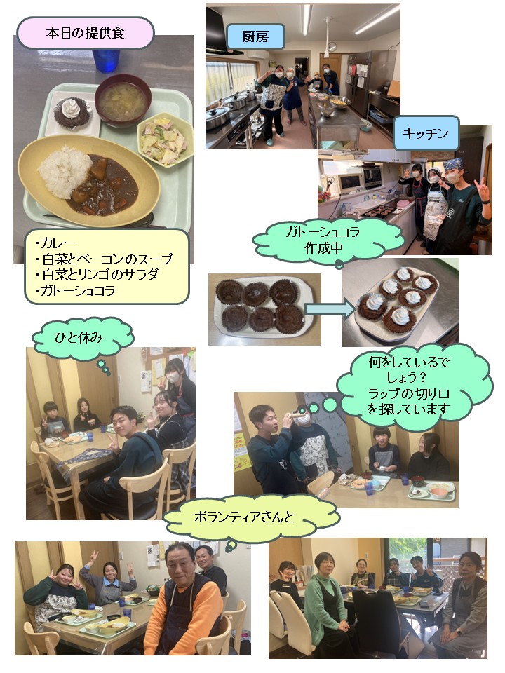 カレーは、天草の方からいただいて冷凍していたイノシシのミンチを久しぶりに使用。臭みもなく、赤身で鉄分も多い。言わなければ皆さんわからないみたいです。カレーのルーは大人用と子ども用で分けて作っています。大人用のカレーは固形とフレーク2種を混ぜて...。男性のボランティアさんにも好評でミモザのカレーが一番といわれる方も。今回は、フレークの種類を変えましたが、みんなで、うん?その人にわかるかな?と変えたことは内緒に。さあ、わかったでしょうか?